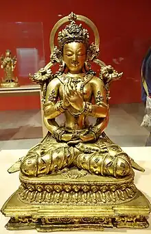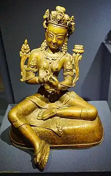 She is an important figure in Esoteric Buddhism (Vajrayāna) and appears in various esoteric Buddhist sources, like the Sādhanamāla, Niṣpannayogāvali, the Caṇḍamahāroṣaṇa tantra, Dhāranisamuccaya, Mañjusrimūlakalpa, and the Vairocanābhisaṃbodhi Sūtra.[1] Prajñāpāramitā Devī was widely depicted in Indian Buddhist art from around the 9th to 12th centuries, particularly in the art of the Pala Empire. She is also widely found in the Buddhist art of other regions like Java, Cambodia, Tibet and the Himalayan region.[1] Himalayan and Tibetan art may depict her as either a bodhisattva or as a Buddha.[1]