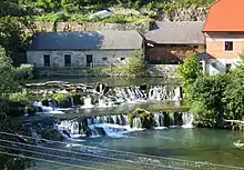 There are two mills on the left bank of the Krka River in the southwestern part of Prapreče. The Vehovec Grain Mill and Sawmill (Vehovčev mlin in žaga) dates from about 1800 and is housed in the lower part of a two-story building. The grain mill operated in it for 200 years before it was removed in 1980. The sawmill had a Venetian frame saw that stopped working in 1950 and was removed. The millrace and sluice have been preserved.[4] The Zajc Mill (Zajčev mlin) stands immediately southeast of the Vehovec Mill in a building that dates to the first quarter of the 19th century but has been remodeled several times. It contains two old-fashioned sets of millstones and a roller mill, and it stands nest to a small hydroelectric station with a radial Francis turbine.[5]