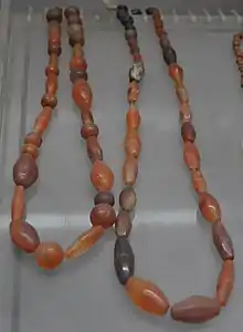 Beads are classified into two periods, each featuring a different type of interaction. Period 1 (earlier period) beads corresponds to the last centuries BC, and Period 2 corresponds to the first millennium AD. The character of Period 1 beads suggest well-established exchange relationships between South-east Asian and Indian populations due to the high volume of ornaments discovered within South-east Asia, as well as their quality demonstrated by the use of skilled Indian technologies. These relationships are assumed to have dated back to the first half of the first millennium BC. Other prestigious goods possessed by individuals within these communities were codified ornaments. Some examples of these ornaments are Dong Son drums, Sa Huynh ornaments and bronze knobbed ware.[6]