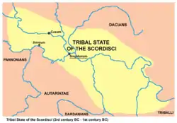 In 279 BC, after the Gallic invasion of the Balkans, the Scordisci tribal state[18] was formed in Serbia. They took the strategic hill fort of Singidunum, modern Belgrade and built Taurunum (Zemun). They subjugated most of the tribes that came in their way, Illyrians, West Thracians and Paeonians and were at one time the most powerful tribe of the Balkans. From 141 BC and onwards they are fighting with the Romans, they are defeated in 135 BC, victorious in 118 BC against Sextus Pompey and again in 114 BC against Gaius Porcius Cato and then defeated in 107 BC, but are still holding a significant part of Pannonia. They invade Macedonia with the Dardani and Maedi, coming as far as Delphi, plundering the temple but are eventually defeated and driven across the Danube in 88 BC. There they are subjugated by the Dacians under Burebista in 56–50 BC, and finally, in 15 BC they are Roman subjects, beginning their Romanization.