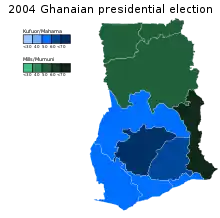 Kufuor was re-elected in presidential and parliamentary elections held on 7 December 2004, earning 52.45% of the popular vote in the first round. This avoided a run-off and resulted in the New Patriotic Party securing more seats in the Parliament of Ghana.[2]