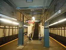 This station's platform has wide I-beam columns painted in blue on both sides at regular intervals with alternating ones having the standard black station name plate with white lettering. The track walls have their original Dual Contracts trim line with "P" tablets on it at regular intervals for "President." Towards the south end of the station, where the platform was extended in the 1950s to accommodate the current standard IRT train length of 510 feet (160 m), the walls have "PRESIDENT ST" in white sans serif font on a blue border.