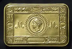 The funding was used to manufacture small boxes made of brass; however, due to metal shortages in the later stages of the war some tins were made from plated base metals or alloys.[6] Each tin was decorated with an image of Mary and other military and imperial symbols along with the names of the UK's then allies.[5] The design was by Stanley Adshead and Stanley Ramsey.[5] Obtaining enough brass strip to make the boxes remained a continual problem, a situation not helped when a large consignment from the US was lost due to the sinking of the RMS Lusitania.[5] Not all the items would fit in the brass box, so the collective gift including the brass box was contained and distributed in a cardboard box.[7]