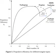 The propulsive efficiency formula for air-breathing engines is given below.[2][3] It can be derived by setting in the general equation, and assuming that . This cancels out the mass-flow and leads to: