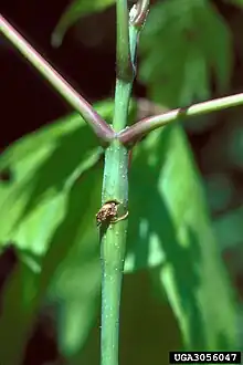 The larvae feed on Acer negundo and possibly other Acer species. Young larvae feed along the veins or midribs, usually on the lower leaf surfaces. They construct shelters of webbing and frass. Third instar larvae move to the base of petioles and bore into dormant leaf buds. The species overwinters in its fourth instar stage within a silken cocoon within a dormant leaf bud. After winter, the larvae leaves their shelter and burrows into another bud. A single larva destroys two to three buds during the fourth instar. Fifth instar larvae bore into the new stem growth of twigs and terminals and feed within the swollen or galled shoots. When fully grown, the larvae drop to the ground and construct pupation cells in the humus layer of the soil.