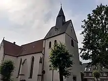 A church in Borgholzhausen was first mentioned in a 1169 document as a church (Eigenkirche) of the Counts of Ravensberg.[1] The present church, replacing earlier structures, was built beginning in 1340. It was expanded by a Gothic choir in 1496.[2][3] A carved stone altarpiece was added in 1501.
