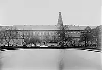 In the 1590s, Christian IV began building a new naval harbor on Slotsholmen. Proviantgården was constructed by the builder Bernt Pejtersen around 1605. The building was meant to furnish the king's ships with provisions when they came into the harbor.[1][2] As such Holmen's grainstores were transferred to the building after it was completed.[1]