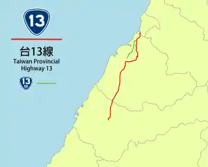 Provincial Highway 13 is a north–south highway that connects Hsinchu City with Fengyuan, a suburb in Taichung City. The highway is known as Jianfeng Highway (尖豐公路) from Toufen to Fengyuan. The total length is 69.6 kilometers.[1]