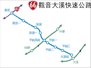 Provincial Highway 66 (Chinese: 台66線) is an expressway, which begins in Guanyin District, Taoyuan City on Provincial Highway 61 and ends in Daxi District, Taoyuan City, on County Road 112A.