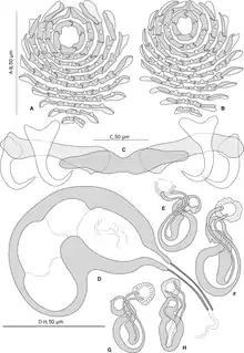 | Pseudorhabdosynochus sosia, sclerotised parts: squamodiscs and haptoral parts on top, male and female parts on bottom | |