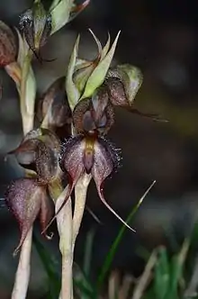 Pterostylis boormanii, is a terrestrial, perennial, deciduous, herb with an underground tuber. It has a rosette of between eight and fourteen elliptic leaves at the base of the flowering spike, each leaf 15–35 mm (0.6–1 in) long and 8–14 mm (0.3–0.6 in) wide. The leaves are usually withered by flowering time. Up to seven dark reddish-brown flowers with translucent windows and 27–30 mm (1.1–1.2 in) long, 10–12 mm (0.4–0.5 in) wide are borne on a flowering spike 50–200 mm (2–8 in) tall. Two to five stem leaves are wrapped around the flowering spike. The dorsal sepal and petals form a hood or "galea" over the column with the dorsal sepal having an upturned, thread-like tip 8–10 mm (0.3–0.4 in) long. The lateral sepals turn downwards, are wider than the galea, have thickened hairy edges and suddenly taper to narrow tips 10–15 mm (0.4–0.6 in) long which spread apart from each other. The labellum is thick, brown and insect-like, 4–5 mm (0.16–0.20 in) long and about 2 mm (0.08 in) wide. The "head" end has many short hairs and the "body" has five to eight hairs up to 4 mm (0.2 in) long on each side. Flowering occurs from September to November.[3][4][5][6]
