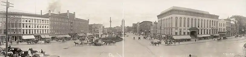 On May 13, 1849, a fire started inside the American Hotel, killing one. Most of Public Square and buildings on three adjacent streets were destroyed.[4] The fire destroyed nearly all of the business portion of the city, including three banks, post office, three printing offices, two hotels, and thirty stores.[5] The square was immediately rebuilt for $250,000 (Now $8,794,000).[6] Several buildings erected during the rebuilding still stand. In the rebuilding of the 1850s, the city created three parks at the square's center, with a fountain inside the center park. During Watertown's industrial boom in the late 19th and early 20th centuries, Public Square became the heart of Watertown's retail, business and social life. In the 1950s, the three parks in the square's center were combined into one large park.