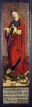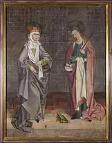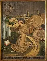 On the upper part of the rear side of the wings were pairs of saints. The surviving left wing shows the patron saint of the country, St. Ludmila, together with St. Ursula, who was popular in the hospital fraternity as a protector against the plague; the missing right part may have depicted St. Wenceslas. At the bottom of the rear side of the wing is St. Augustine teaching the Knights of the Cross, among whom is again the figure of Nikolaus Puchner. On the other wing is a scene of the stigmatization of St. Francis. The saint has a direct connection with St. Agnes as the founder of the Convent of Saint Agnes in Prague, and the apparition of the Holy Cross, carried by a seraph, refers to the Order of the Knights of the Cross. The composition comes from a graphic design by Monogrammist E.S.[6] The individual parts of the retable were complemented in the lower part by inscriptions, which have only partially survived.