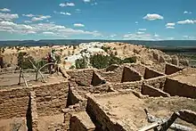 Spaces were generally divided into four sections aligned with the cardinal directions, which held religious significance. The great houses at Pueblo Alto were aligned along a north–south axis.[4] Entrances to structures were generally south or southeast facing.[2][4] This provided shade from summer sun and warmth from winter sun.[2] The back of the buildings were joined together with a large wall to provide shelter from wind.[4] At the center of the structure was a plaza, meant to serve as a community center.[4] It was also common to have ball courts and platform mounds.[2]