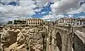 The construction of the newest bridge (the one standing as of 2017) was started in 1759 and took 34 years.[1] There is a chamber above the central arch that was used for a variety of purposes, including as a prison. During the 1936–1939 civil war both sides allegedly used the prison as a torture chamber for captured opponents, killing some by throwing them from the windows to the rocks at the bottom of the El Tajo gorge.[2] The chamber is entered through a square building that was once the guard-house. It now contains an exhibition describing the bridge's history and construction.