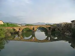 Queen Muniadona, wife of King Sancho III was the queen who gave her name to the town and the bridge, also known as the Puente Románico.[2] She built the six-arched Romanesque bridge (42°40′16″N 1°49′07″W / 42.671117°N 1.818736°W) over the Arga for the use of pilgrims on their way to Santiago de Compostela along the Camino de Santiago.[3]