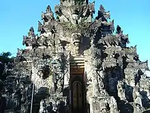 The outer sanctum or jaba pisan is located right beside the main street of the village, basically, it is the street itself. Access to the middle sanctum is provided by a paduraksa gate carved with intricately in northern Balinese style. The paduraksa features monstrous Bhoma head on top of the portal. Beyond the paduraksa gate is the middle sanctum or jaba tengah. The middle sanctum is where several Balinese pavilions (bale) i.e. bale jeroan ("food pavilion") used to prepare cooking for offering and bale gong ("gong pavilion") to keep and perform the gamelan orchestra are situated.[4]
