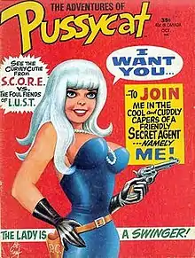 While Pussycat eschewed outright nudity it followed much of the Little Annie Fanny template, also centring on a kind, buxom and oblivious blonde who ends up undressed in front of gawping males but usually ends up successfully completing her objective despite - or even because of - her complete lack of awareness of the situation around her. However, unlike Annie's everywoman tour of American culture, Pussycat's adventures were linked to another fad of the period, the spy genre. Her employers S.C.O.R.E. and their enemies L.U.S.T. were reminiscent of U.N.C.L.E. and T.H.R.U.S.H. from the smash-hit TV series The Man from U.N.C.L.E..[1]