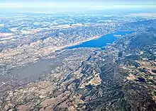 Aerial view of Putah Creek flowing into Lake Berryessa