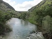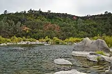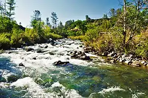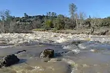 Putah Creek (Patwin: Liwaito[3]) is a major stream in Northern California, a tributary of the Yolo Bypass, and ultimately, the Sacramento River. The 85-mile-long (137 km)[2] creek has its headwaters in the Mayacamas Mountains, a part of the Coast Range, and flows east through two dams. First, Monticello Dam forms Lake Berryessa, below which Putah Creek forms the border of Yolo and Solano Counties, and then flows to the Putah Diversion Dam and Lake Solano. After several drought years in the late 1980s, the majority of Putah Creek went dry, prompting a landmark lawsuit that resulted in the signing of the Putah Creek Accord in 2000. The Accord established releases from the dams to maintain stream flows in Putah Creek, with natural flow regimes which spike in winter/spring and ebb in summer/fall. The restoration of natural flow regimes has resulted in a doubling of riparian bird species and a return of spawning native steelhead trout and Chinook salmon, as well as protecting the livelihood of farmers on the lower watershed.[4][5]