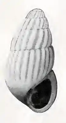 The bluish-white, rather solid shell has an elongate-ovate shape. Its length measures 4 mm. The whorls of the protoconch are decollated. The five whorls of the teleoconch are well rounded, and strongly shouldered at the summit. They are marked by stout, well-rounded, somewhat sinuous, decidedly protractive, axial ribs, which are about as wide as the spaces that separate them. Of these ribs, 14 occur upon the first, 16 upon the second, 18 upon the third, and 22 upon the penultimate turn. These ribs render the summit of the whorls decidedly crenulated. In addition to the ribs the intercostal spaces are marked between the sutures by exceedingly fine, closely spaced, spiral striations, of which about 35 are present upon the third turn. The sutures are strongly impressed. The periphery of the body whorl is well rounded. The base of the shell is moderately long, narrowly umbilicated, and well rounded. It is marked by the feeble continuation of the axial ribs, and numerous spiral striations The aperture is oval. The posterior angle is obtuse. The outer lip is rather thick. The inner lip is decidedly curved, and somewhat reflected. It is provided with a very strong, oblique fold at its insertion. The parietal wall is covered by a thick callus, which renders the peritreme practically complete.[2]
