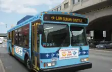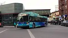 In December 2015, the MTA announced that the Q70 SBS would be implemented in September 2016,[31][32] when it was rebranded as the LaGuardia Link with the implementation of off-board payment of fares. This is similar as to what the Riders Alliance proposed, but the route would still require a free transfer or a regular fare.[33] As opposed to other SBS routes, the Q70 was to be wrapped in a teal blue scheme with silhouettes of clouds and airplanes. The buses would also have the text "LaGuardia Link" on the front, back, and both sides, in addition to the route emblems for the E, F, M, R, and 7 routes and the abbreviation "LIRR," which connect to the bus at Woodside–61st Street and at Jackson Heights–Roosevelt Avenue. The rebranding was to encourage more people to take public transportation when using the airport.[34][35] The insides of the buses were to have air traveler branded messaging.[2]