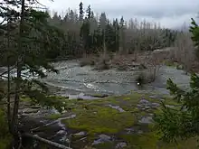 The diverse biotic environment includes many species, including over 60 water bird species.[26] The aviary population includes endangered species such as the great blue heron. The birds are removing 3% of fish heading out to the Salish sea.[27] The herons live in woodlands adjacent to estuaries, but they are very sensitive to human activity and can abandon their nests if people come too close.[28]