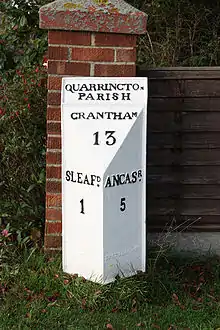 Quarrington is a settlement south west of Sleaford, a market town in the North Kesteven district of Lincolnshire. Quarrington proper is clustered around Town Road and between Grantham Road (the B1517) and London Road. To the north of Grantham Road is Quarrington Hill and to the north and east of the old village is New Quarrington; all the settlements are linked by contiguous housing developments to form a suburb of Sleaford.[29][30] Lincolnshire County Council's State of the Environment Report (1994) found that roughly three-quarters of Lincolnshire is low-lying, with much of it near sea-level;[31] Quarrington lies between approximately 15 and 25 meters above sea level, close to Lincoln Cliff, a limestone scarp running north–south through Lindsey and Kesteven.[32][33] The bedrock under most of Quarrington is Cornbrash limestone belonging to the Great Oolite Group of Jurassic rocks formed 168−165 million years ago.[34] The soil belongs to the Quarrington series, a type of brown, calcareous sand.[32] The county's agricultural land is generally of "very good" quality; as a result, intensive arable and vegetable farming is predominant while pastoral farming declined in the 20th century.[35] Quarrington and Sleaford are on the edge of the Fens, a low-lying region of the East of England which, before drainage from the 17th to the 20th centuries, was marshy and liable to flooding. Draining has revealed nutrient-rich soils and enabled 88% of the land to be cultivated, especially for arable farming, and most of it is graded amongst the most productive farmland in the country.[36][37]