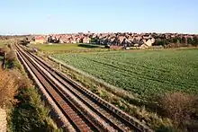 The town's fields were enclosed in 1796 and a map of the village was drawn up at the same time, showing the settlement along Town Road and Townside Road with Rector Field and Earl Field to the north and north-east respectively.[16][21] At the time, more than 210 acres of land were allotted to the rectory by Lord Bristol in place of the tithes it had previously been entitled to.[22] During the mid and late-19th century, the population of the old village of Quarrington declined (from 98 in 1851 to 72 in 1871). Aside from the rectory and church, the village included two large farms and a cluster of labourers cottages around Town Road.[23] By 1872, the parish spanned 1,620 acres and the village contained 63 houses. The same year, Trollope wrote that "the appearance of this small village, lying around its well cared for church, is very pleasing".[16] As Sleaford expanded, houses were built along London and Station Roads, pushing the town inside the Quarrington parish boundaries in what became New Quarrington.[23] Sanitation in the poorest parts of Sleaford worsened during the 19th century and a Local Board of Health was charged with improving living conditions. In 1879, Lord Bristol sold land on Quarrington Hill to the board, who built a pumping station to transport clean fenland water east into the town.[24]