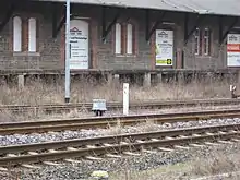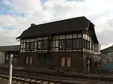 The Quedlinburg wagon factory (Quedlinburger Waggonfabrik), founded in 1927 was south of the Bode and west of the former Schäferwiese ("shepherd meadow"). It had a connection to the Quäke at kilometre 16.20. Tanker and acid pot wagons were mainly repaired here, less frequently other freight wagons and also passenger carriages until the 1960s. More than 300 acid pot wagons were manufactured in Quedlinburg from 1936 to 1964.[26] As an independent company, the factory had about 60 employees. The operation became part of the Einheit repair shop in Leipzig in 1971. There were no own locomotives for shunting on site, so they had to be requested when needed. Steam and diesel locomotives were used here until 1972, afterwards a Kö II locomotive was used until 1988 and a V 60 locomotive was used until its closure on 31 December 1993. After the suspension of passenger traffic on the Quäke, platform 1 West of the station was also used as a siding. But parts of the line to Weddersleben served as a shunting area. After its closure in late 1993, the buildings were offered for sale. Due to their dilapidated condition, parts of the roof collapsed on 6 April 6, 2004[27] and they were demolished in early 2005.