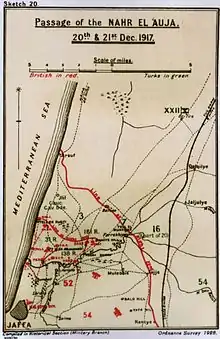 52nd (L) Division's next operation was the tricky passage of the Nahr el Auja to launch the Battle of Jaffa. A patrol of 4th RS crossed on a tarpaulin boat built by the Royal Engineers to reconnoitre the position on the night of 13/14 December. The assault troops of the division then practised using similar canvas boats on a village pond, then at 22.30 on the evening of 20 December, in heavy rain, the first assaulting waves of 156th Bde went forward under cover of an artillery barrage and established a bridgehead. Bridging was made difficult by the flooded river, but the Royal Engineers got the follow-up battalions including 4th Royal Scots across by raft. Accompanied by a section of the brigade machine gun company and a Stokes mortar the battalion attacked 'Slag Heap Farm' and captured it without serious difficulty. By 06.00 the brigade was digging in on a strong line, ready for any counter-attack, but none came: the Turks had been completely surprised, and were in full retreat. The advance was renewed up the coast on the morning of 22 December, with fire support from HMS Grafton and gunboats. 156th Brigade advancing in the centre came under shellfire, but casualties were few. Before nightfall, 52nd (L) Division reached the castle of Arsuf overlooking the Plain of Sharon, where it halted. The Official History describes the passage of the Auja as 'one of the most remarkable feats of the Palestine Campaign'. 4th Royal Scots suffered only 5 ORs killed, 1 officer and 21 ORs wounded.[38][54][64][74][75][76]