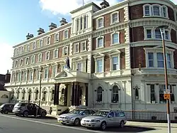 Queen Hotel is constructed in brick and stucco in an Italianate style,[2] and has a slate roof.[1] The main block has four storeys and a basement, with eleven windows on the Station Road side, facing the station, one on the rounded corner, and eight on the City Road side. To the south, on City Road, is a lower wing with ten windows. A single-storey stable wing, now used for additional rooms, joins the east side of the hotel to the station. It has an archway for coaches, with four bays to the right and two bays to the left. On the Station Road side of the main block is a porch with Corinthian columns and seven steps leading up to the entrance. Standing on the pediment of the porch is a statue of Queen Victoria by Thomas Thornycroft.[1] On the City Road side is another porch, constructed in Portland stone, and in Art Deco style.[2]