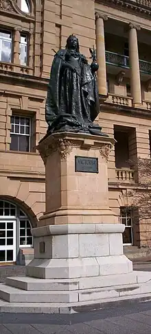 A bronze statue of Queen Victoria, a replica by English sculptor Thomas Brock of the original in Portsmouth, was erected in mid-1906.[3] The purchase was arranged by local artist Godfrey Rivers, and was funded by public subscription and subsidies from state and local government. The pedestal was designed by the Public Works Department and crafted by local stonemason William Kitchen, at a cost of £567.[1]