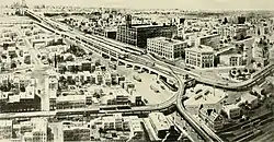In 1960, the city's Department of Traffic proposed demolishing the abandoned northern half of the Queensboro Plaza station to improve traffic flow.[30] The abandoned structure was demolished in 1964.[17] As part of the project, an overpass was constructed from the station towards Queens Plaza North, spanning the site of the demolished platforms.[31] One set of crossovers between the BMT and IRT lines remains on the upper level, the Flushing Line's only connection to the rest of the system.[32] This connection is used for non-revenue moves, specifically to transfer subway cars to the Coney Island Shops for repairs, to transfer new cars to the Flushing Line,[32] or to move rolling stock to or from the Flushing line.