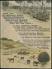 The Queensland Government Savings Bank was established by one of the earliest pieces of legislation enacted by the government of the new colony of Queensland in 1861. Intended to encourage small deposit saving by working people, savings banks could be established by the gazettal of an application by ten or more house or landholders in any community of more than 500 people. In 1864, the Government Savings Bank Bill provided a government guarantee to protect trustees and deposits and to allow depositors to easily transfer accounts from one town to another.[1]