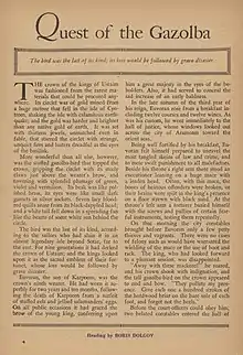 "The Voyage of King Euvoran" (or "Quest of the Gazolba") is a short story by American author Clark Ashton Smith as part of his Zothique cycle. It was first published as "The Voyage of King Euvoran" in the 1933 book The Double Shadow and Other Fantasies. It was republished as "Quest of the Gazolba" in the September 1947 issue of Weird Tales where it was the cover story with art by Boris Dolgov.[1]