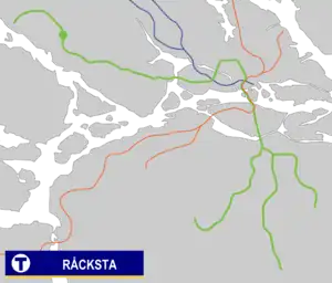 Råcksta metro station is a station on the Green line of the Stockholm metro. It is located in the district of Råcksta, which is part of the borough of Hässelby-Vällingby in the west of the city of Stockholm.[2] The station is situated on an embankment and has a single island platform, with access from a lower level station building on Jämtlandsgatan.[3] The distance to Slussen is 14.8 km (9.2 mi).