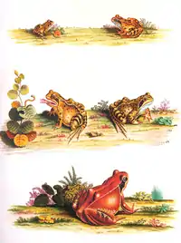 His artistic talent gave him a very good reputation so that he lived comfortably while painting and he could use his spare time to observe insects, amphibians and reptiles in nature. He collected eggs and larvae in order to raise them at home and to study their development and their metamorphoses. His detailed observations, more useful by being accompanied by very beautiful illustrations, were published in two large books. The first, Insecten-Belustigung, appeared in 1740 and was devoted to the insects and other invertebrates like the sea anemones. His classification of the insects followed a natural system and he is regarded as one of the fathers of German entomology.[2] The fourth part is practically a monograph of the spider Araneus diadematus. The description of the animal is illustrated by six plates which show the differences in variation of the colouring of the species. They show also internal dissections. Rosenhof was interested in the production of silk but he confused the anus with the opening of silk-producing glands.