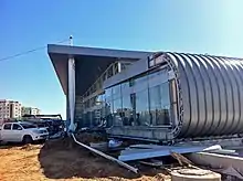 The station building is of the shape of a book lying on its side. Its floor area is 600m², and is connected through a 50m footbridge to the platforms, which are below ground. Each platform is 300m long.