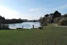 Radford in the parish of Plymstock in Devon is a historic manor and the oldest recorded seat of the prominent Harris family.[1] It is today a low-cost housing suburb of the City of Plymouth. The 16th century manor house of the Harris family was remodelled in the 18th century and was demolished in 1937.[2] However, various traces of the estate remain, including most notably the deerpark, now a public amenity known as Radford Park, with its large lake, an early 19th century gate-lodge at the entrance drive to the former mansion house, with gatepiers, on Radford Park Road, a bridge and boathouse with follies of a sham castle and another sham-ruin.[3]