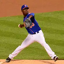 Montero was promoted on May 14, 2014, with Dillon Gee going to the disabled list with a lat strain.[6] Montero started against the New York Yankees at Citi Field on the same day. In the top of the third inning, he struck out shortstop Derek Jeter for his first major league strikeout on a 3-2 fastball.[7] He earned his second strikeout against Brett Gardner in the top of the fifth inning.[8] Montero earned the loss as the Mets lost 0-4 as he pitched six innings giving up 5 hits, 3 runs, 2 home runs, 2 walks and struck out 3. He was sent down on May 31 to make room for Buddy Carlyle on the roster.[9][10] On August 11, pitcher Jacob deGrom went on the disabled list with rotator cuff tendinitis. Montero was called up on August 12 in deGrom's place.[11] On August 23, Montero was re-sent back to the 51s to make room for deGrom coming off the disabled list.[12] He was recalled on September 6 as part of the September call-ups.[13] He was later moved to the bullpen on September 13.[14] Montero finished the season with a 1-3 record, 4.06 ERA in 10 games with 42 strikeouts in 44.1 innings pitched with a WHIP of 1.511 while giving up 44 hits, 21 runs (20 of them earned), 8 home runs, and 23 walks.