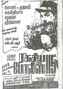 Ragasiya Police 115 (transl.Secret Agent 115) is a 1968 Tamil-language spy film, directed by B. R. Panthulu. The film stars M. G. Ramachandran (MGR) and J. Jayalalithaa, supported by M. N. Nambiar, S. A. Ashokan and Nagesh. It was released on 11 January 1968,[1] and ran for 100 days in theatres, becoming hit at the box office.[2][3]