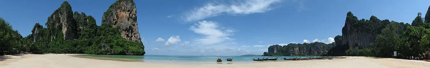 Railay (Thai: ไร่เลย์, pronounced [râj lēː]), also known as Rai Leh, is a small peninsula between the city of Krabi and Ao Nang in Thailand.[1] It is accessible only by boat due to high limestone cliffs cutting off mainland access. These cliffs attract rock climbers from all over the world, but the area is also popular due to its beautiful beaches and quiet relaxing atmosphere. Accommodation ranges from bungalows and medium-priced resorts in East Railay to a collection of luxury resorts focused on West Railay, though one, Royavadee, spans both waterfronts and also has a beachfront restaurant at Ao Phra Nang. The four main areas of Railay consist of Phra Nang, West Railay, East Railay, and Ton Sai. Ton Sai caters to climbers and the backpacker set and is more rustic than the glitz of West Railay and the shops and restaurants of the East Railay boardwalk.