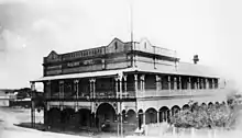 The original timber hotel was moved to the opposite side of the road to make way for the construction of the new hotel and burned down shortly afterwards. 1901 was a year of fires and whole blocks on both sides of Macrossan Street were destroyed. A number of buildings, including the Imperial Hotel, were replaced in brick. Bricks had been made locally in Ravenswood since the early days and production capacity increased to meet the demand of the early 1900s. However, it is said that the bricks for the Railway Hotel were constructed at Moran's property at Connolly Creek by an Italian brickmaker. It is possible that this was the first major brick building in Ravenswood as his advertisements for the hotel stress the number of bricks used in the construction, which suggests a certain novelty value. The new hotel offered budget accommodation in a basement level and better quality rooms on the top floor. Moran is thought to have installed a water supply system from the London Mine, situated opposite the hotel, with the water being pumped by a hand pump on the balcony, for which the drain can still be seen. The Moran family ran the hotel until the 1950s, when it was taken over by the current family of publicans.[1]