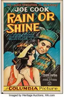 Rain or Shine is a 1930 American pre-Code film directed by Frank Capra and starring Joe Cook and Louise Fazenda. The film was adapted from a hit Broadway musical of the same name and was originally planned as a full-scale musical. Due to the public backlash against musical films (beginning in the latter part of the summer of 1930), all musical numbers were discarded before release. This move proved to be prudent as the film was a box office success, continuing the streak of hits Capra directed for the young Columbia Pictures studio.[1]