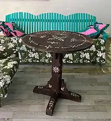 Pearl inlay decorates this early 20th century table. Its top is constructed from packing case planking. Behind is a typical mid 20th century home-made couch and cushions. The applique embroidery style tivaevae was introduced by the missionaries.