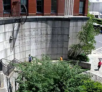 The park is across First Avenue from the United Nations headquarters. (This stretch of First Avenue is also known as "United Nations Plaza".) The granite staircase in the park's northwest corner leads to 43rd Street and the Tudor City apartments. It was built and dedicated in 1948 during construction of the U.N. headquarters and has the famous quotation from Isaiah 2:4: "They shall beat their swords into plowshares, and their spears into pruning hooks; nation shall not lift up sword against nation, neither shall they learn war any more" incised into its wall. Known as the Isaiah Wall, it was rededicated in 1975 and had the name "Isaiah" added under the final word.[2] In 1981 the staircase was named the Sharansky Steps in honor of Soviet dissident Natan Sharansky.[1]