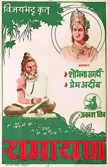 Ramayan is a 1954 Hindi religious film based on Valmiki's Ramayana, produced and directed by Vijay Bhatt for Prakash Pictures. The music directors were Shankar Rao Vyas and Hariprasanna Das[1] and the lyrics were written by Ramesh Gupta, Pandit Indra, Neelkanth Tiwari, Baalam Pardesi.[2] The film starred Prem Adib and Shobhana Samarth once again as Rama and Sita. The two actors had earlier acted in a trilogy of Bhatt's films based on the Ramayana, Bharat Milap (1942), Ram Rajya (1943) and Rambaan (1946). All three had been extremely successful, with the audience accepting them in the traditional roles.[3] The other costars included Shahu Modak, Durga Khote, and Umakant.[4]