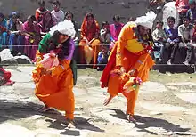The Ramman begins with an invocation to Ganesha, the remover of obstacles followed by the dance of Ganesha and Parvati. This is followed by the dance of the Sun God, an enactment of the creation-myth of the birth of Brahma and Ganesha. The other dances include the dance of the Bur Deva along with Gopi Chand (Krishna) and Radhika, the Mwar-Mwarin dance that showcases the travails of the buffalo herders and the Baniya-Baniyain Nritya (dance of the trader-couple) that shows the hardships faced by the common people.[5] After these initial performances, the focus now shifts to the enactment of the local Ramkatha. Episodes from Rama’s life, beginning with his visit to Janakpur and culminating with his coronation following his return from exile, are sung to a total of 324 beats and steps. Another important aspect of these performances is the singing of Jagar, a musical rendition of local legends.[5]