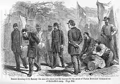 At the outbreak of the Civil War, the Ramseys, who were states' rights Democrats, sided with the Confederacy,[3] drawing them further into conflict with Brownlow, who was a radical anti-secessionist. In December 1861, John Crozier Ramsey, who had been appointed Knox County's district attorney, had Brownlow jailed on charges of conspiring to burn railroad bridges in East Tennessee. The Ramseys demanded Brownlow be hanged, but the Confederate Army, fearing a public backlash, released him. Due in part to Brownlow's influence, J.G.M. Ramsey's Mecklenburg mansion— with its invaluable library— was burned when the Union Army occupied Knoxville in 1863.[4]